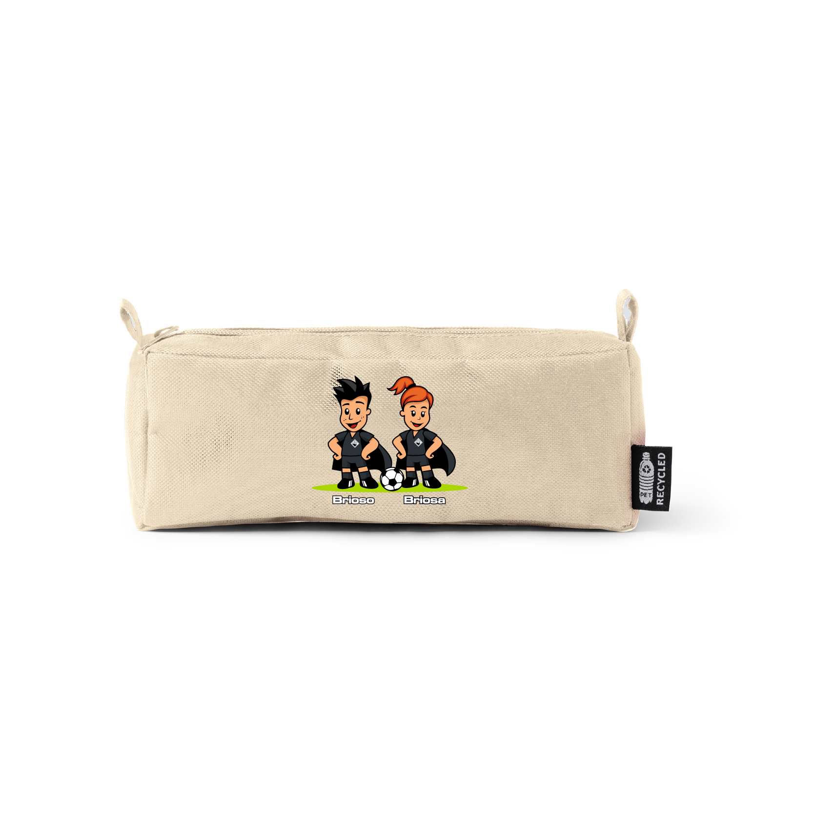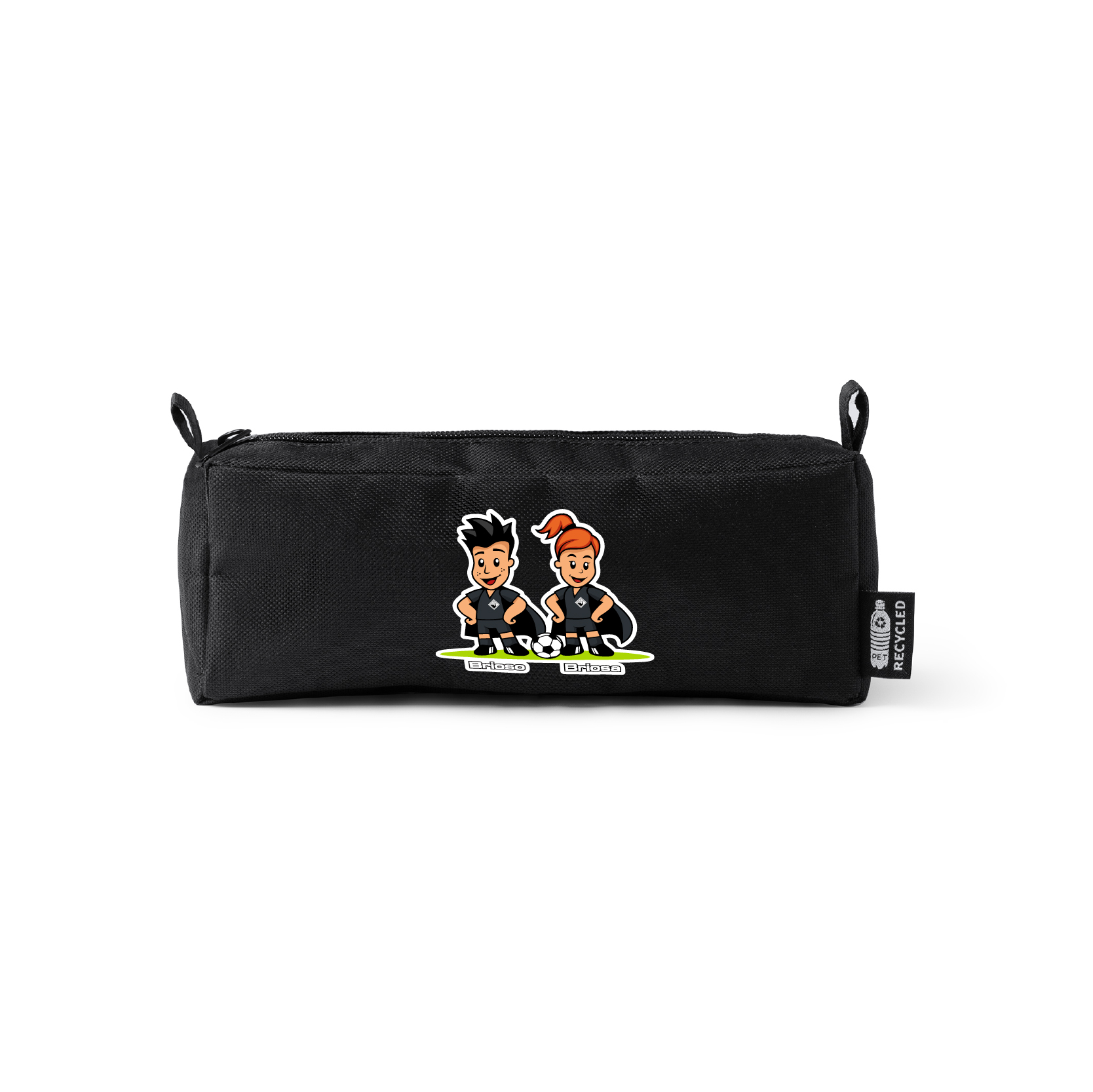 Porta-lápis em material RPET, proveniente de garrafas de plástico recicladas, com fecho a condizer.