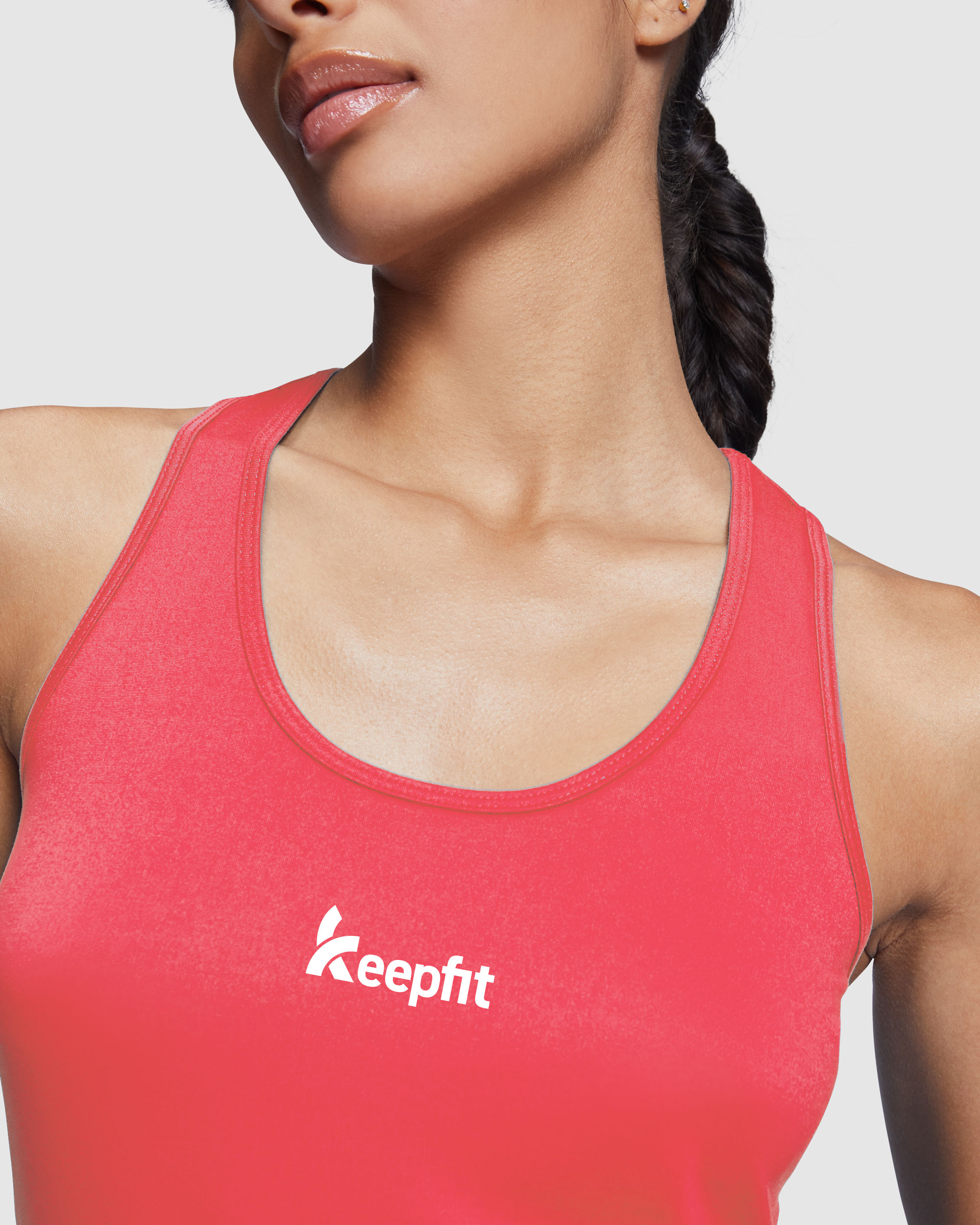 T-shirt desportiva com costas estilo nadadora. Tecido de poliéster com “tato de algodão”. Tecido adaptável ao corpo. Corte cintado.